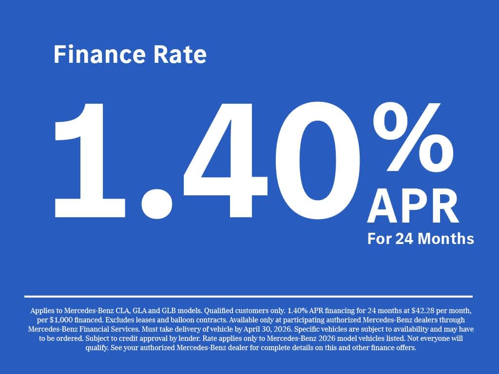 Base MSRP excludes transportation and handling charges, destination charges, taxes, title, registration, preparation and documentary fees, tags, labor and installation charges, insurance, and optional equipment, products, packages and accessories. Options, model availability and actual dealer price may vary. See dealer for details, costs and terms. Price excludes tax, title, license, government fees, and a $399 documentary fee. Price does not include additional options selected by the customer. Preferred Package includes dealer add-ons and any addendums for this vehicle. All advertised vehicles are subject to actual dealer availability. Must qualify for all applicable incentives and savings. Prices include all dealer allowances and dealer savings. Images displayed may not be representative of the actual trim level of a vehicle. Colors shown are the most accurate representations available. We do not and cannot guarantee that every vehicle sold will be recall-free. All vehicles are one of each. All Pre-Owned or Certified vehicles are Pre-Owned. All offers expire at close of business on the day the offer is removed from this website, and all financing is subject to credit approval. Prices excludes tax, title, and license. Any agreement is subject to execution of contract documents. It is the customer's responsibility to verify the existence and condition of any equipment listed. While great effort is made to ensure the accuracy of the information on this website, errors do occur so please verify information with one of our dealership representatives and have any understanding included in the contract documents. While great effort is made to ensure the accuracy of the information on this site, errors do occur so please verify information with one of our dealership representatives. **The charging voucher is subject to the program terms of Mercedes-Benz USA’s service provider ChargePoint, which are presented to the customer when the Mercedes me Charge service is activated. All MY25 BEV customers, excluding eSprinter, also receive 2 years of free unlimited charging at Mercedes-Benz High Power Charging (“MB HPC”) network; those charging sessions are always free during such 2-year period and are therefore not covered by the $1,000 charging voucher if selected. However, idle fees incurred at MB HPC stations are the responsibility of the customer and will be charged to the customer’s Mercedes me Charge account, which could be covered by either a valid payment method associated with the account or the balance of the charging voucher. The offer is non-refundable, non-transferrable, and non-cancelable once a selection has been made and has no cash value. Additionally, the offer is subject to change and may be discontinued at any time.