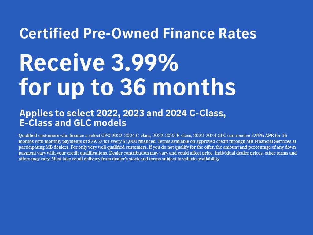 Base MSRP excludes transportation and handling charges, destination charges, taxes, title, registration, preparation and documentary fees, tags, labor and installation charges, insurance, and optional equipment, products, packages and accessories. Options, model availability and actual dealer price may vary. See dealer for details, costs and terms. Price excludes tax, title, license, government fees, and a $399 documentary fee. Price does not include additional options selected by the customer. Preferred Package includes dealer add-ons and any addendums for this vehicle. All advertised vehicles are subject to actual dealer availability. Must qualify for all applicable incentives and savings Prices include all dealer savings and dealer incentives. Images displayed may not be representative of the actual trim level of a vehicle. Colors shown are the most accurate representations available. We do not and cannot guarantee that every vehicle sold will be recall-free. All vehicles are one of each. All Pre-Owned or Certified vehicles are Pre-Owned. All offers expire at close of business on the day the offer is removed from this website, and all financing is subject to credit approval. Prices excludes tax, title, and license. Any agreement is subject to execution of contract documents. It is the customer's responsibility to verify the existence and condition of any equipment listed. While great effort is made to ensure the accuracy of the information on this website, errors do occur so please verify information with one of our dealership representatives and have any understanding included in the contract documents. While great effort is made to ensure the accuracy of the information on this site, errors do occur so please verify information with one of our dealership representatives. **The charging voucher is subject to the program terms of Mercedes-Benz USA’s service provider ChargePoint, which are presented to the customer when the Mercedes me Charge service is activated. All MY25 BEV customers, excluding eSprinter, also receive 2 years of free unlimited charging at Mercedes-Benz High Power Charging (“MB HPC”) network; those charging sessions are always free during such 2-year period and are therefore not covered by the $1,000 charging voucher if selected. However, idle fees incurred at MB HPC stations are the responsibility of the customer and will be charged to the customer’s Mercedes me Charge account, which could be covered by either a valid payment method associated with the account or the balance of the charging voucher. The offer is non-refundable, non-transferrable, and non-cancelable once a selection has been made and has no cash value. Additionally, the offer is subject to change and may be discontinued at any time.