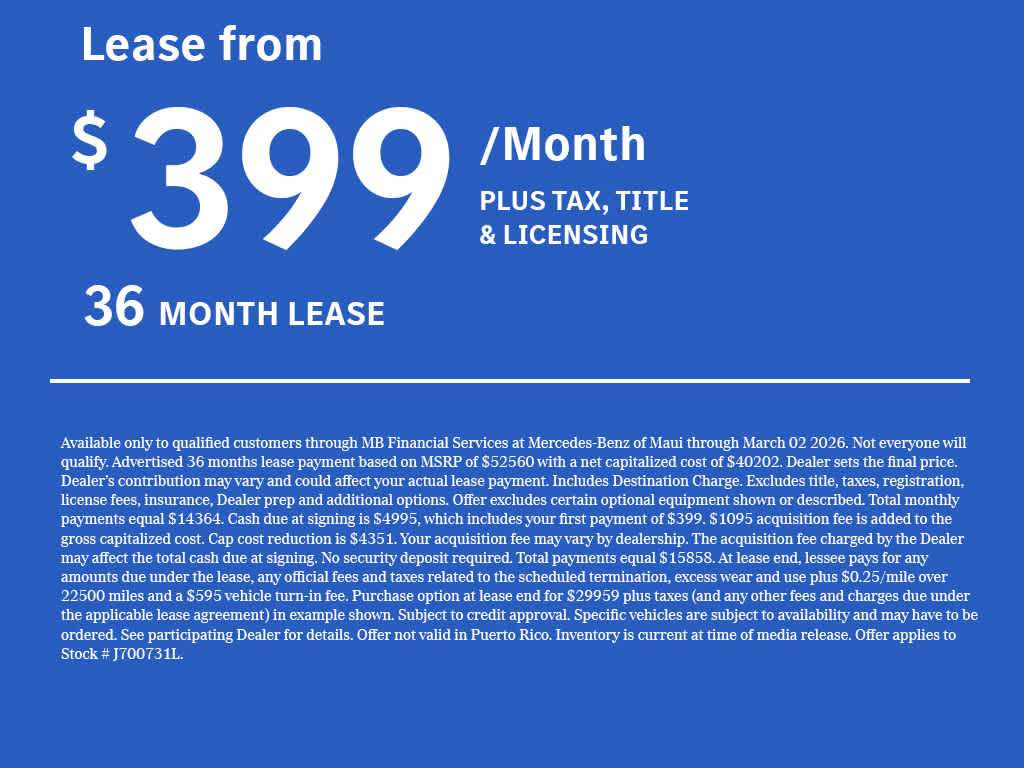 Base MSRP excludes transportation and handling charges, destination charges, taxes, title, registration, preparation and documentary fees, tags, labor and installation charges, insurance, and optional equipment, products, packages and accessories. Options, model availability and actual dealer price may vary. See dealer for details, costs and terms. Price excludes tax, title, license, government fees, and a $399 documentary fee. Price does not include additional options selected by the customer. Preferred Package includes dealer add-ons and any addendums for this vehicle. All advertised vehicles are subject to actual dealer availability. Must qualify for all applicable incentives and savings Prices include all dealer savings and dealer incentives. Images displayed may not be representative of the actual trim level of a vehicle. Colors shown are the most accurate representations available. We do not and cannot guarantee that every vehicle sold will be recall-free. All vehicles are one of each. All Pre-Owned or Certified vehicles are Pre-Owned. All offers expire at close of business on the day the offer is removed from this website, and all financing is subject to credit approval. Prices excludes tax, title, and license. Any agreement is subject to execution of contract documents. It is the customer's responsibility to verify the existence and condition of any equipment listed. While great effort is made to ensure the accuracy of the information on this website, errors do occur so please verify information with one of our dealership representatives and have any understanding included in the contract documents. While great effort is made to ensure the accuracy of the information on this site, errors do occur so please verify information with one of our dealership representatives. **The charging voucher is subject to the program terms of Mercedes-Benz USA’s service provider ChargePoint, which are presented to the customer when the Mercedes me Charge service is activated. All MY25 BEV customers, excluding eSprinter, also receive 2 years of free unlimited charging at Mercedes-Benz High Power Charging (“MB HPC”) network; those charging sessions are always free during such 2-year period and are therefore not covered by the $1,000 charging voucher if selected. However, idle fees incurred at MB HPC stations are the responsibility of the customer and will be charged to the customer’s Mercedes me Charge account, which could be covered by either a valid payment method associated with the account or the balance of the charging voucher. The offer is non-refundable, non-transferrable, and non-cancelable once a selection has been made and has no cash value. Additionally, the offer is subject to change and may be discontinued at any time.